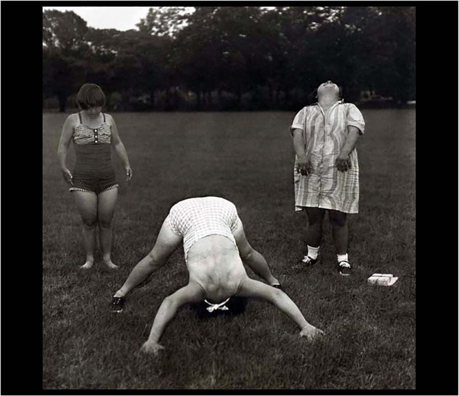 Influenciada por Model y la película Freaks (La parada de los monstruos o Fenómenos, en castellano) de Tod Browning, Diane Arbus eligió a personas marginales para sus fotografías: gemelos, enfermos mentales, gigantes, familias disfuncionales, fenómenos de circo, etc. Los personajes miraban directamente a la cámara, lo que hace que el flash revele sus defectos. Su intención era producir en el espectador «temor y vergüenza». Fue Pionera del flash de relleno (flash de día). La fotografía de Diane representa lo normal como monstruoso: cuando fotografía el dolor, lo encuentra en personas normales. Provoca que la gente presuntamente normal aparezca como anormal. Rompe la composición, sitúa al personaje en el centro. Su mirada siempre es directa, con tensión y fuerza. Para ella no existe el momento decisivo, trabaja en continuo espacio temporal y obliga a los retratados a que sean conscientes de que están siendo retratados. Busca una mirada nueva, pasando del tedio a la fascinación.