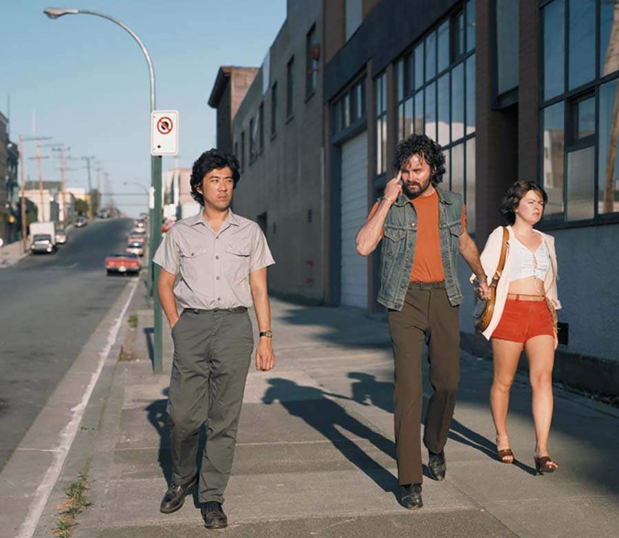 Una famosa imagen de Jeff Wall es Mimic de 1982. Resulta ser una transparencia de color de 198 cm por 229 cm. En ella vemos a tres personas, una pareja y un hombre, caminando hacia la cámara sobre un lado de la acera. La calle pertenece a un suburbio en una ciudad norteamericana, un área residencial mezclada con pequeñas industrias. La pareja, a la derecha en la imagen, es blanca, y el hombre de la izquierda es de origen asiático. La mujer lleva unos pantalones cortos rojos y un top blanco mostrando su ombligo. Su novio lleva un chaleco, con una barba poblada y pelo despeinado; dan la impresión de ser de clase trabajadora. El hombre asiático está vestido elegantemente, con una camisa gris; da la impresión de ser de clase media. El novio hace un gesto racista al girar su cara hacia fuera para mirar de reojo al hombre asiático. La imagen ha sido tomada en el momento justo en que se produce el gesto y revela la tensión social. Sin embargo, esta escena ha sido construida meticulosamente al igual que si fuera una imagen cinematográfica.