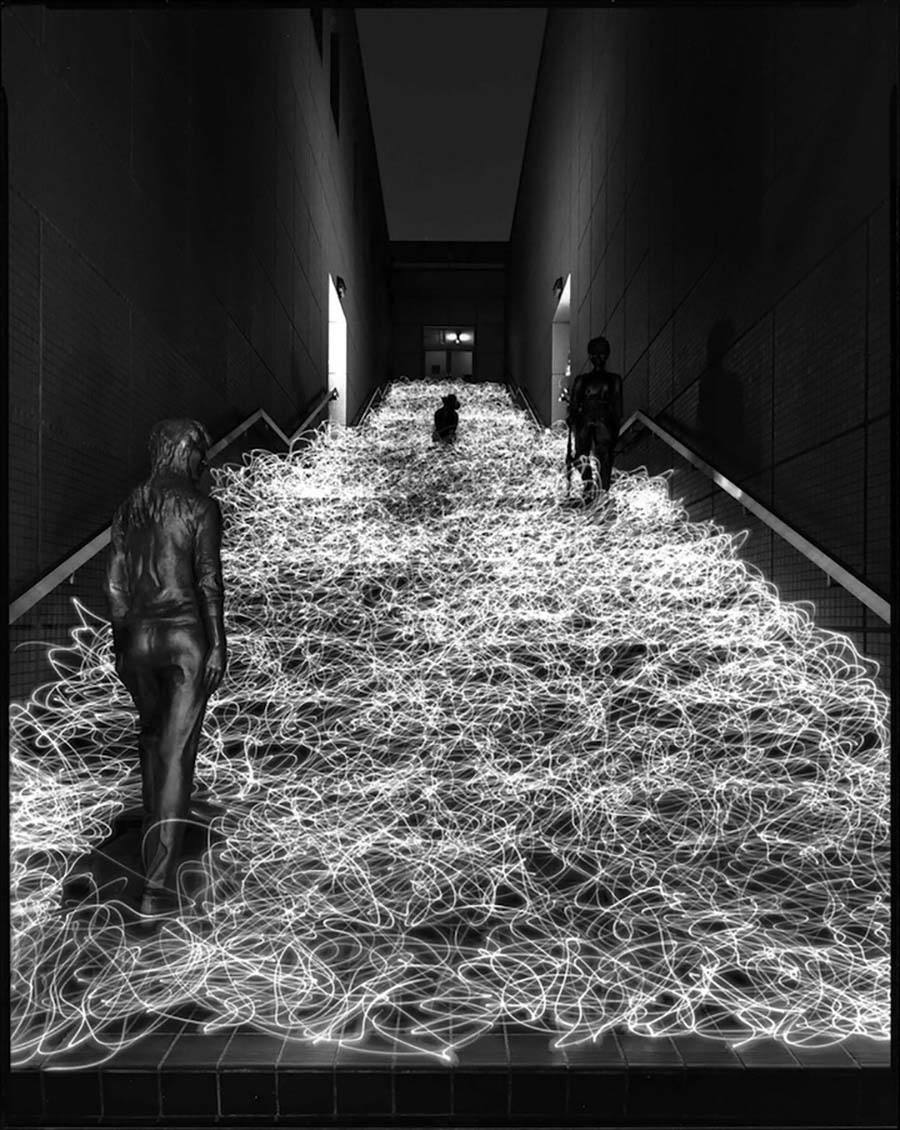 Reconocido por su interacción lúdica luminosa, Sato utiliza una cámara de gran formato para exposiciones que duran de una a tres horas, mientras se mueve por el espacio creando puntos de luz o líneas iluminadas dibujadas con linternas o flashes hechos por espejos reflectores. Los resultados son fotografías detalladas interrumpidas por patrones de luz. Y debido a las largas exposiciones, la cámara no puede detectar los movimientos de Sato en la escena; la fotografía captura su presencia pero no su imagen.
